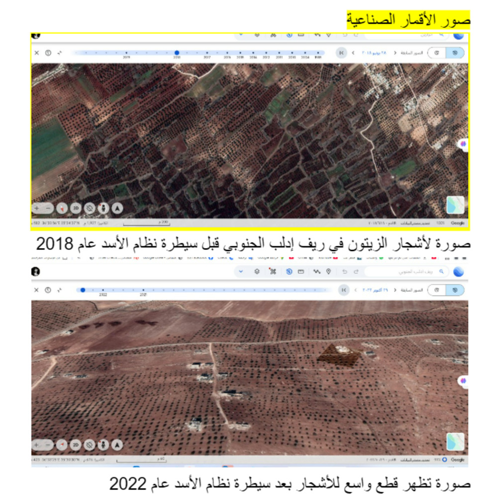 ويضيف: "الأشجار لم يقطعها المدنيون، بل الجيش هو من كان مسؤولاً عن التحطيب. كانت هناك ورشات خاصة تأتي لقطع الأشجار وقلعها في المناطق البعيدة عن أنظار الناس. في خان شيخون مثلاً، عادت بعض العائلات قبل سقوط النظام بسنوات قليلة لتحصيل مواسمهم الزراعية، لكن قطع الأشجار حصل فيها عند اقتحام الجيش لها، وبعد عودة بعض العائلات إلى المنطقة، ويتم بشكل منظم تحت حماية الأجهزة الأمنية."