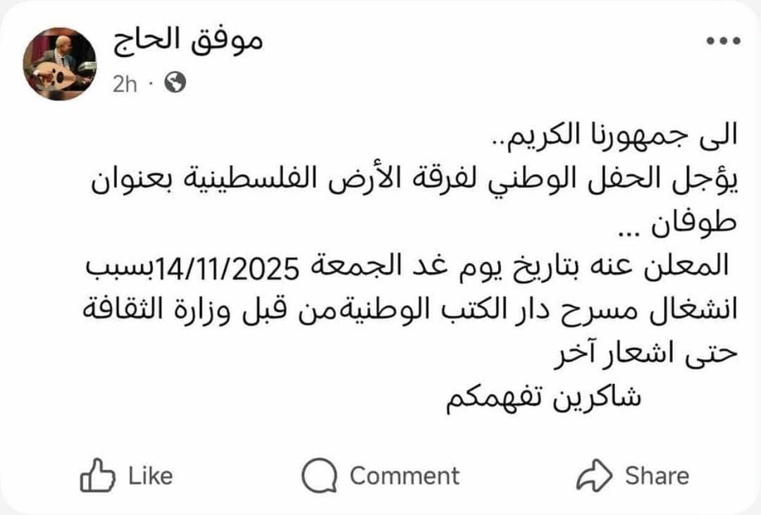 أعلنت وسائل إعلام محلية في سوريا عن إلغاء فعالية ثقافية كان من المفترض إقامتها في مدينة حلب يوم الجمعة، بعنوان "طوفان الأقصى" وبمشاركة فرقة موسيقية فلسطينية. وكانت مديرية الثقافة في حلب قد دعت إلى الفعالية قبل أن يتم التراجع عنها بشكل مفاجئ.