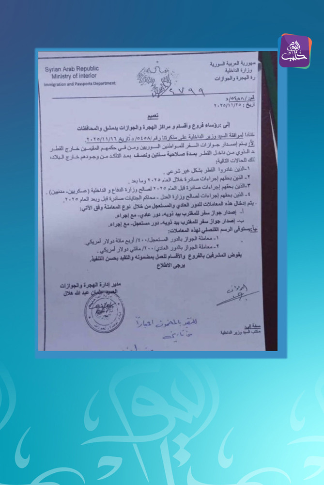 تحت جنح الظلام، وبغياب أي إعلان رسمي حتى الآن، قامت إدارة الهجرة والجوازات بإصدار تعميم ينص على تقليص مدة جواز السفر من ست سنوات إلى سنتين ونصف، كما كان الوضع قبل سقوط نظام الأسد، وذلك لفئات معينة من السوريين المغتربين.