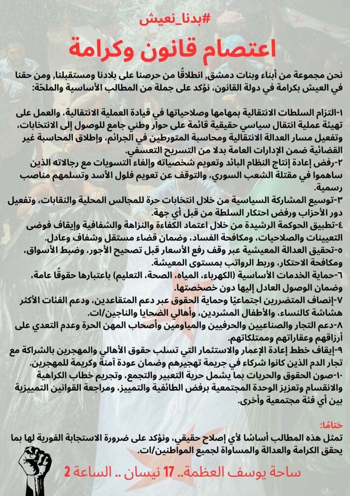 يستعد ناشطون سوريون للاعتصام تحت شعار "قانون وكرامة" يوم 17 نيسان/أبريل في ساحة يوسف العظمة بدمشق، تزامناً مع الذكرى الثمانين لجلاء الاحتلال الفرنسي. يأتي ذلك وسط جدل متصاعد حول شكل المرحلة الانتقالية وحدود دور السلطة الحالية، وتفاقم الضغوط الاجتماعية والاقتصادية.