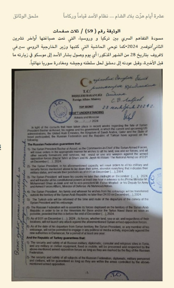 أدناه ترجمة حرفية للصفحة الأولى (المنشورة جانباً) والصفحة الثانية (غير المنشورة هنا) من المسودة التي تُرك مكان تاريخها (اليوم والشهر) فارغاً إلى أن يقوم الطرف الروسي بالموافقة عليها كما هو أو بعد تعديلها، كما يمكن أن نفهم. وبحسب معلوماتي اللاحقة، فإن المسودة أبرمت بصيغتها النهائية بعد بضعة أيام على ذلك (أوائل ديسمبر 2024)، وحين كان «بشار الأسد» لا يزال في دمشق، بعد أن أخذت تركيا بالملاحظات والتعديلات الروسية. لكني لم أستطع الحصول على النص المبرم بصيغته النهائية حين انتهيت من كتاب«عشرة أيام هزّت بلاد الشام... نظام الأسد قياماً وحطاماً» في آذار/ مارس الماضي، وحين وضعته زوجتي بعهدة « مكتب حماية المكية الفكرية» الحكومي - البريطاني كأمانة إلى حين نتمكن من نشره،على أن يكون لها وحدها الحق في التصرف به بعد موتي. وقد سجلتْه أيضاً لدى «مؤسسة نيلسنUK Nelson Books»، التي تملك الحق القانوني الاحتكاري في بريطانيا لمنح الكتب ترقيماً دولياً و/أو وطنياً، والتي أعطته الرقم « ISBN: 978-1-7399596-0-9 » بتاريخ 25 آذار/ مارس الماضي.