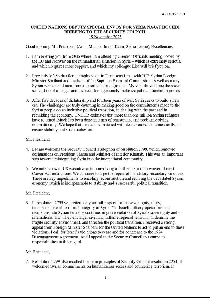 وفي الختام، أكدت أن نجاح العملية السياسية هو أمر حيوي لمصلحة الشعب السوري، وأن الأمم المتحدة مستعدة لمواصلة دعم جهود بناء سوريا مستقرة، موحدة، ذات سيادة، ومزدهرة، تلبّي تطلعات جميع مواطنيها.