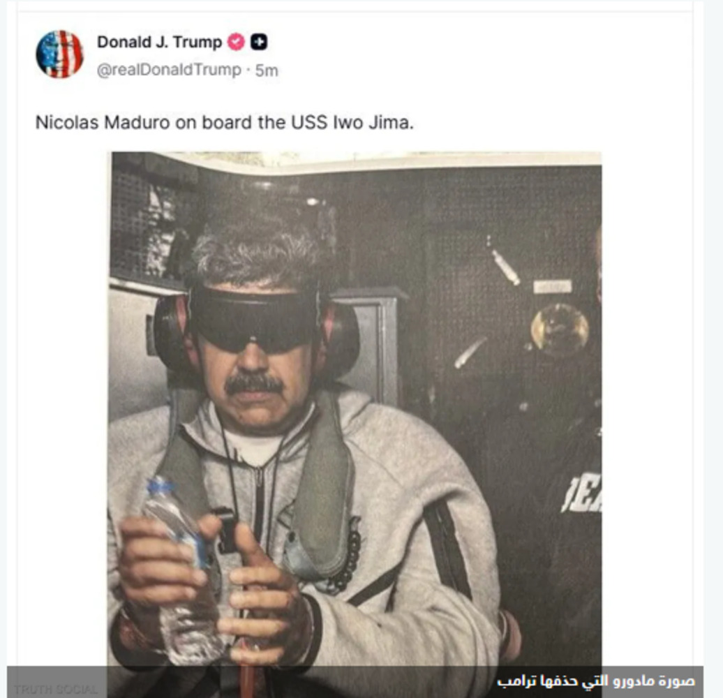 عند التحقق من حساب ترامب، لم يعد يُظهر صورة مادورو. في هذه الصورة، بدا الرئيس الفنزويلي بملابس رياضية، معصوب العينين ومكبل اليدين، بينما كان يحمل قنينة ماء صغيرة.