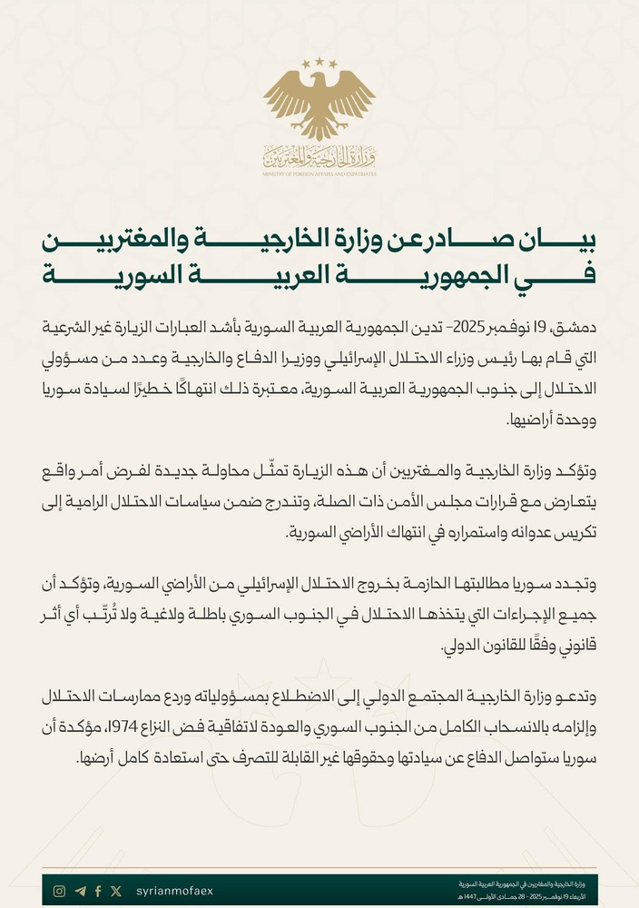 من جانبها، أدانت وزارة الخارجية السورية زيارة نتنياهو والمسؤولين الإسرائيليين إلى جنوب سوريا بأشد العبارات، معتبرةً إياها انتهاكًا صارخًا لسيادة البلاد وخرقًا لقرارات مجلس الأمن.