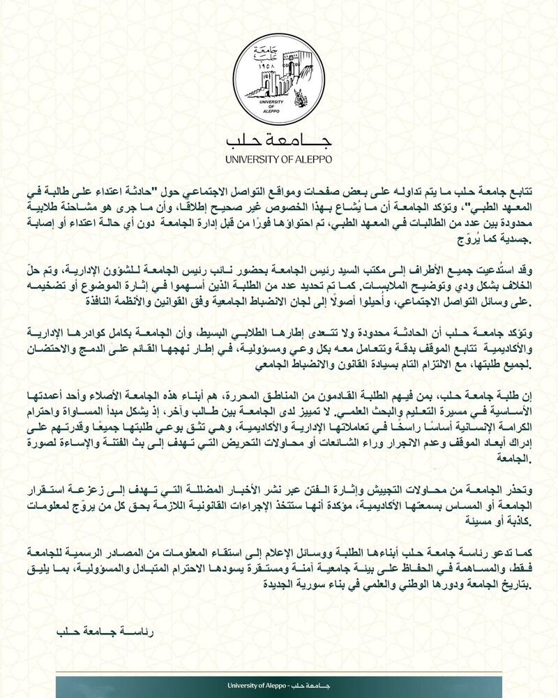 • جامعة حلب تؤكد عدم صحة الأنباء عن حادثة اعتداء على طالبة وتدعو للمسؤولية والهدوء