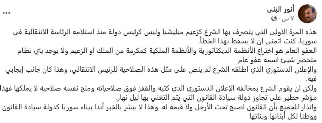 انتقد الحقوقي السوري أنور البني تصرفات رئيس الحكومة السورية المؤقتة أحمد الشرع، معبراً عن رفضه لما وصفه نهجاً ميليشياوياً في إدارة الشأن العام. وكتب البني على صفحته: "هذه المرة الأولى التي يتصرف بها الشرع كزعيم ميليشيا وليس كرئيس دولة".