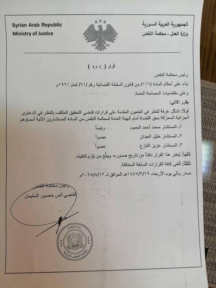 تقدّم 33 محامياً وناشطاً بمذكرة احتجاج رسمية إلى وزارة العدل ورئيس محكمة النقض، يعبرون فيها عن رفضهم للقرار رقم 112 الصادر بتاريخ 13 آب/أغسطس 2025. كان ذلك القرار يتعلق بتشكيل غرفة للنظر في الطعون المقدمة ضد قرارات قاضي التحقيق في الدعاوى الجزائية المرفوعة بحق القضاة أمام الهيئة العامة لمحكمة النقض.