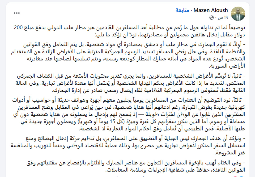 Mazzen Aloush, Director of Public Relations at the authority, explained that customs procedures are conducted in an orderly manner. He clarified that customs at Aleppo and Damascus airports do not confiscate personal belongings, and follow official legal regulations.