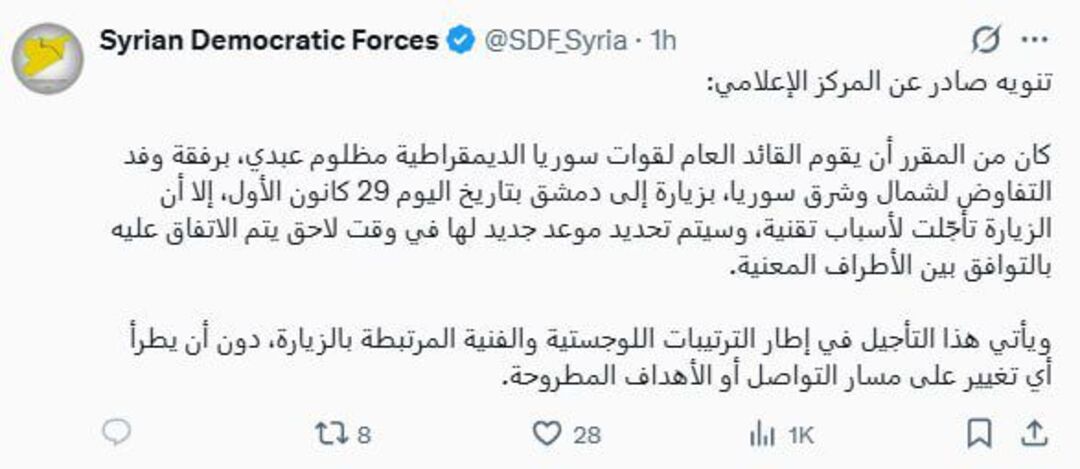 وأكدت قسد في بيانها أن التأجيل جاء ضمن إطار الترتيبات اللوجستية والفنية المرتبطة بالزيارة، مشددةً على أنه لم يطرأ أي تغيير على مسار التواصل القائم أو الأهداف التي تم طرحها.